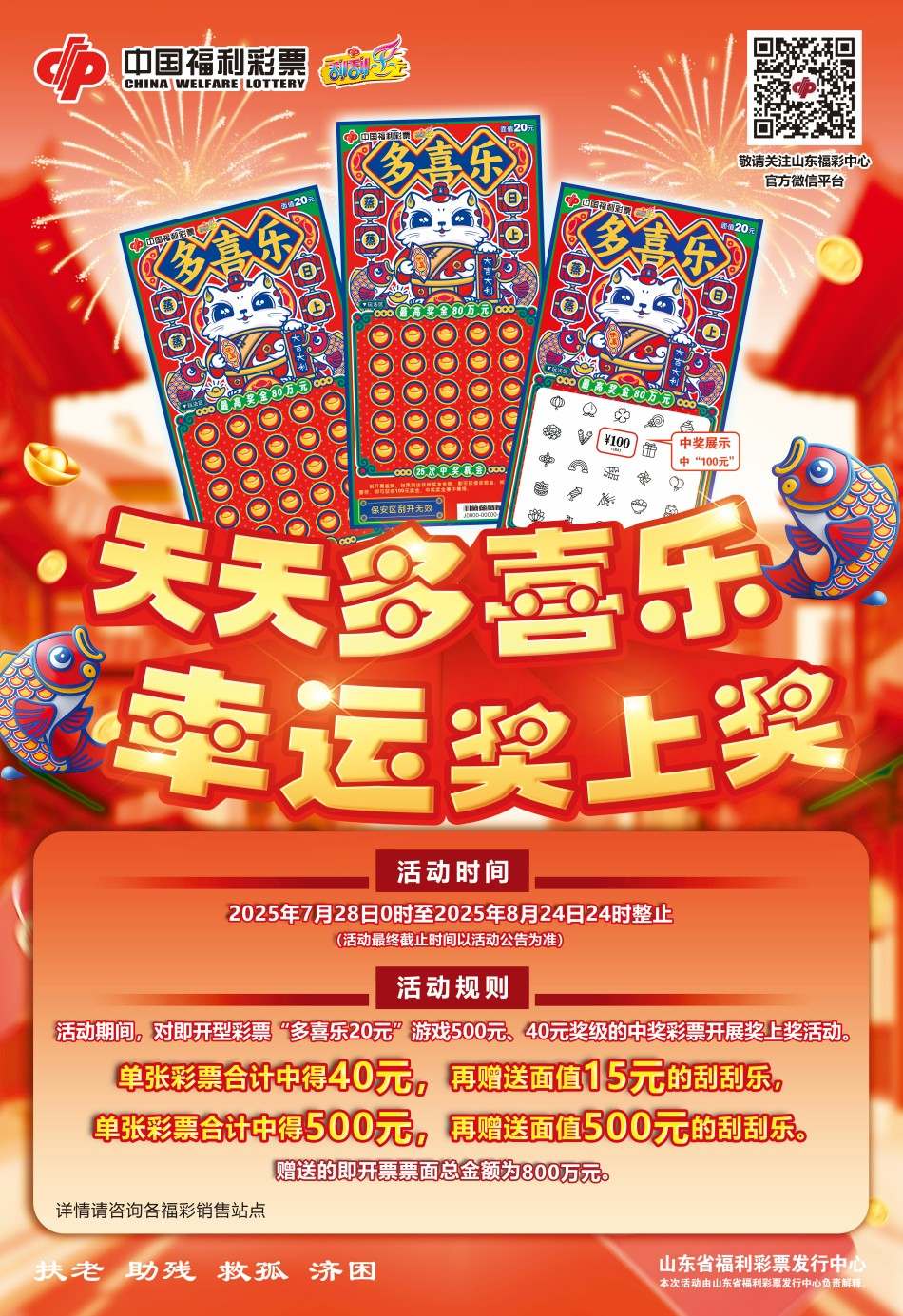 活動(dòng)期間,購彩者在山東省內(nèi)福利彩票銷售場所購買即開票“多喜樂20元”游戲,單張彩票合計(jì)中得40元再獲贈(zèng)面值15元的即開票,單張彩票合計(jì)中得500元再獲贈(zèng)面值500元的即開票。贈(zèng)送的即開票票面總金額800萬元。